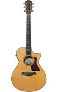 The Taylor 712 is a Grand Concert acoustic guitar constructed with a spruce top and rosewood back and sides. The neck is made from mahogany, while the fretboard is crafted from ebony, with 20 frets.
