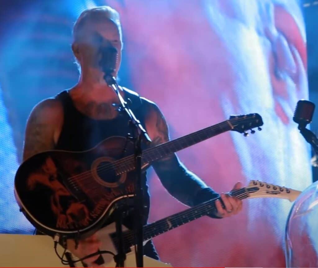 James used a Line 6 Variax 700 modeling guitar during Metallica’s WorldWired Tour from 2016 to 2019. The guitar was however heavily modified in order to work better with what James needed – which was a reliable acoustic guitar that could play both the regular 6 string sound, but also model a 12-string guitar if needed.