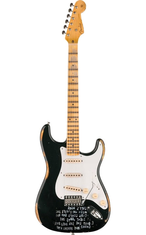 Based on its appearance, the guitar is either an original 1950s vintage Stratocaster or, more likely, a Fender Custom Shop replica. The heavy wear on the body—almost excessive—suggests it may be a relic model from the Custom Shop rather than a naturally aged vintage piece.