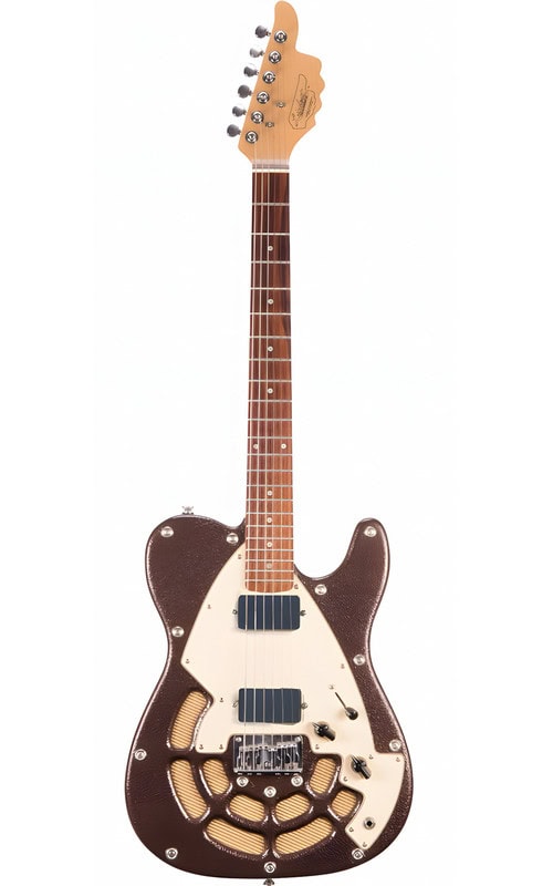 This American-made Lindert Locomotive T guitar (often called the “Thumbs Up” model due to its headstock shape) features a solid-body electric with a single-cut design somewhat reminiscent of a Telecaster, but with Lindert’s unique styling – including a thumb-shaped headstock and distinctive soundhole cutouts. Squire’s Lindert, circa 1996–97, is brown and cream in color with two humbucking pickups.[1]