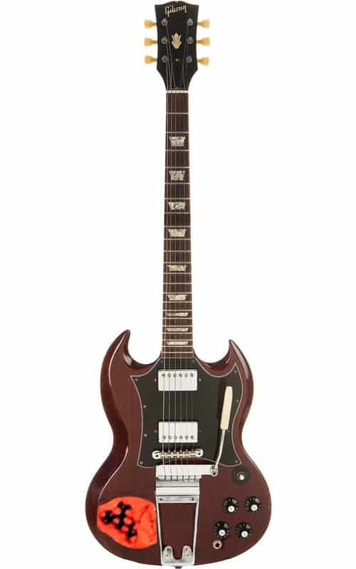 Based on the looks, this was a newer guitar, based on a late 60s Gibson SG model – which has the same large “batwing” pickguard, and the Maestro Vibrola tremolo. The only things that Mac seemed to have done to the guitar was adding an orange sticker above the bridge, and removing the decorative plate from the Maestro Tremolo.