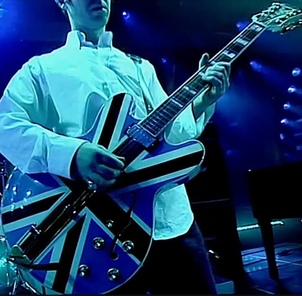 Furthermore, footage from Top of the Pops in February 1996 shows Noel playing the Union Jack Sheraton during “Don’t Look Back in Anger.” However, this guitar has a noticeable difference: it lacks fret markers on the 15th, 17th, and 19th frets. By the Maine Road shows in April 1996, the Union Jack Sheraton Noel used clearly had fret markers in those positions.