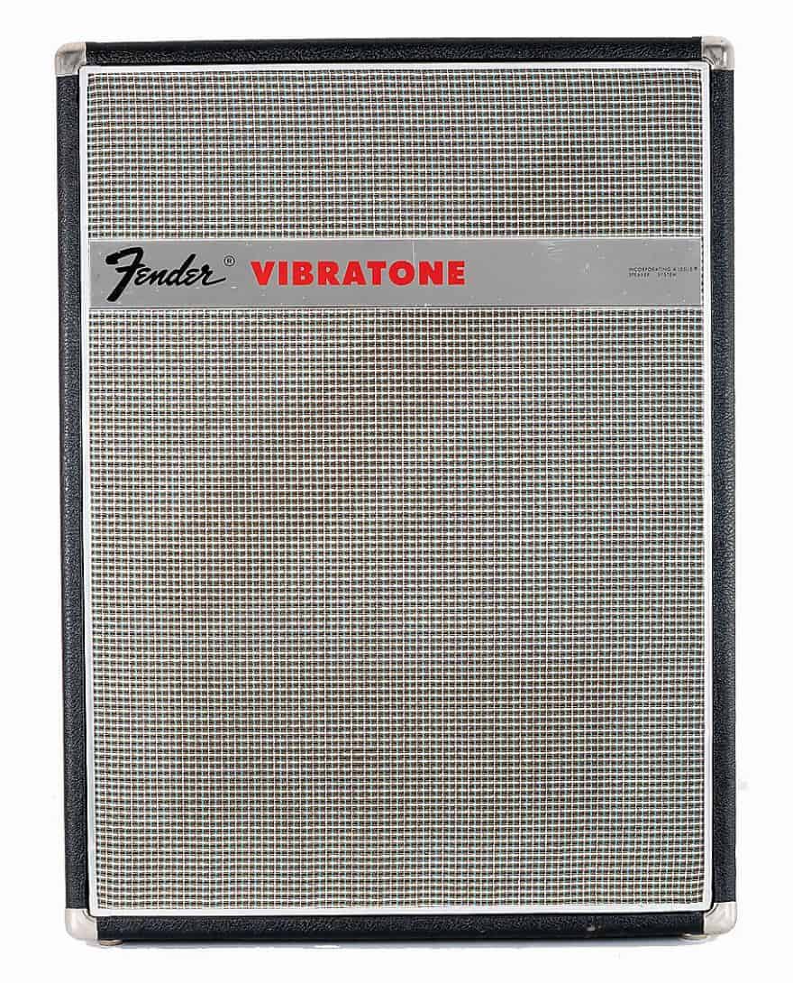 In case you’re unfamiliar with what the Fender Vibratone does – basically, it’s just a cabinet with a speaker inside of it that has the ability to rotate, which creates a “wobbly” sound. Originally, these speakers were intended to be used on Hammond organs, but were quickly adopted by musicians of all kinds, including of course guitarists.
